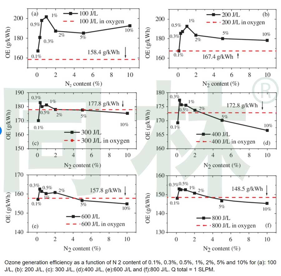 N 2引起的臭氧產(chǎn)量增加與高 SIE 區(qū)域相比,低 SIE 區(qū)域的增加更為顯著。在 100 J/L時(shí),與氧氣相比,添加1% N 2的臭氧生產(chǎn)效率提高了 26.9% 至 201.6 g/kWh 。在 18 J/L 時(shí),在 1.3 g/Nm 3添加 1% N 2時(shí),觀察到的很大臭氧生成效率達(dá)到 252 g/kWh 。在所有探索的 SIE 范圍內(nèi),添加0.3%–2% N 2可以獲得臭氧產(chǎn)量的增加。"