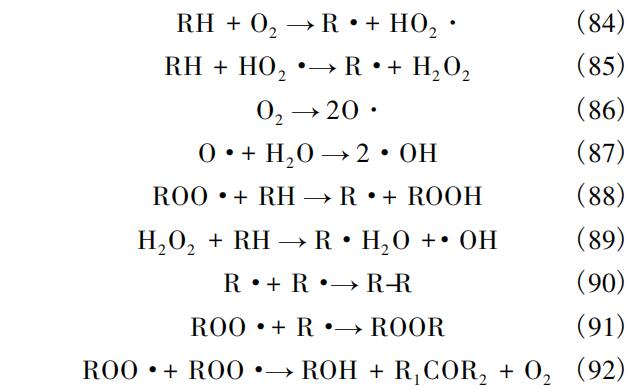 濕式氧化在溫度為 150 ~ 320 ℃,壓力為 0. 5 ~ 20 MPa下,以 O2 或空氣作為氧化劑將有機分子礦化或分解至可生物降解的形態(tài)。其過程主要包含氧傳質(zhì)及化學(xué)反應(yīng),而化學(xué)反應(yīng)過程普遍認(rèn)為是自由基反應(yīng)作為主導(dǎo),分為引發(fā)、傳遞及淬滅階段。在引發(fā)階段,高溫下 O2 和有機分子發(fā)生奪氫反應(yīng)產(chǎn)生 R·和 HO2·; 還有觀點認(rèn)為,O2 在高溫高壓下分解為O·,與 H2O 反應(yīng)產(chǎn)生·OH 也是一條重要途徑,如式( 84) —( 87) 所示。自由基傳遞階段極其復(fù)雜,主要降解反應(yīng)如式( 2) 、( 3) 、( 88) 、( 89) 所示。由于存在自由基之間的淬滅反應(yīng),其 主 要 終 止 反 應(yīng) 如式( 90) —( 92) 所示。