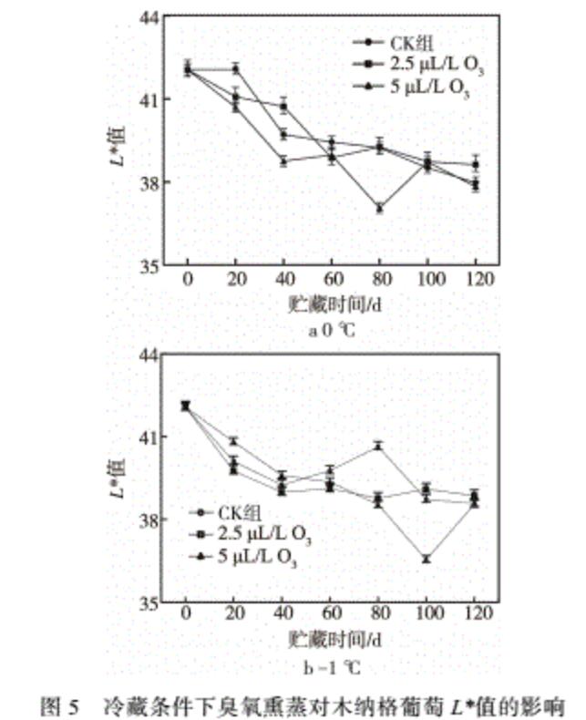 影響臭氧保鮮效果的因素包括處理溫度、臭氧濃度及處理時(shí)間。一般環(huán)境溫度低時(shí),臭氧降解速率慢、有效時(shí)間長(zhǎng),保鮮效果好;一定環(huán)境溫度及濃度范圍內(nèi),臭氧濃度越高、處理時(shí)間越長(zhǎng),其殺菌效果越好、誘導(dǎo)抗病性越強(qiáng)。在該試驗(yàn)中,-1℃臭氧處理組表現(xiàn)出相對(duì)0℃處理組較好的品質(zhì)、較高的好果率;在熏蒸溫度、間隔一致的情況下,與2.5μL/LO3熏蒸組相比,高濃度的5μL/LO3處理其果梗褐變指數(shù)和落粒率較高,表皮L*值低、果肉出現(xiàn)一定程度褐變。在未出現(xiàn)冷害的條件下,果實(shí)貯藏溫度越低其保鮮效果越好。-1℃溫度下,對(duì)照處理木納格葡萄并未表現(xiàn)出冷害特征;同時(shí)該處理溫度下,各O3處理均表現(xiàn)出較0℃時(shí)更高的好果率,O3殺菌效果明顯。可以判定木納格葡萄貯藏下限溫度在-1℃或以下,同時(shí)該溫度下O3殺菌能力亦較好。