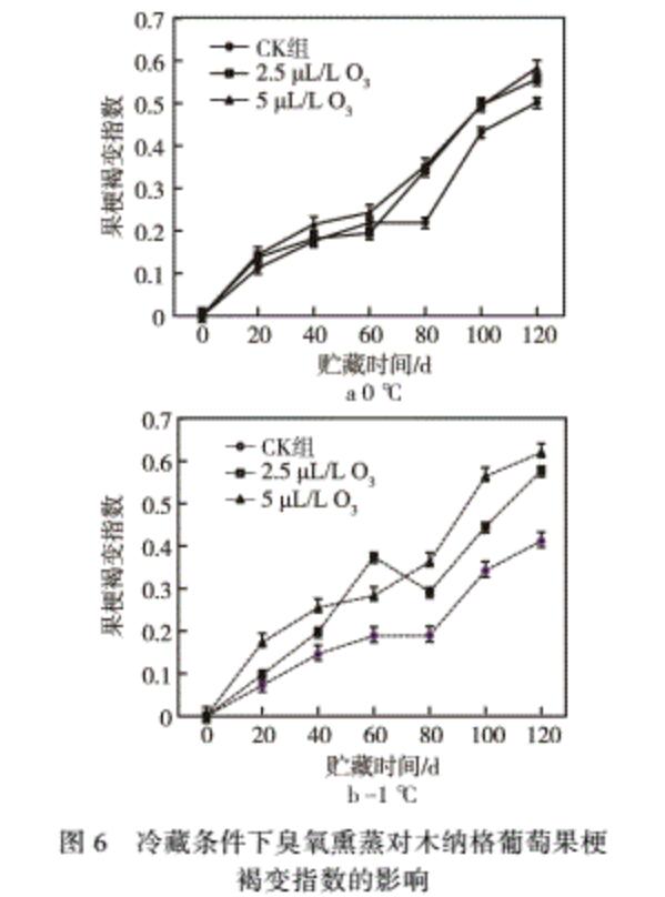 2.5 冷藏條件下臭氧熏蒸對(duì)木納格葡萄貯藏期間果梗褐變的影響