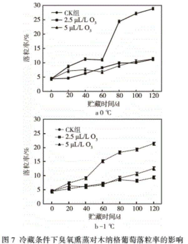 2.6 冷藏條件下臭氧熏蒸對(duì)木納格葡萄貯藏期間落粒率的影響