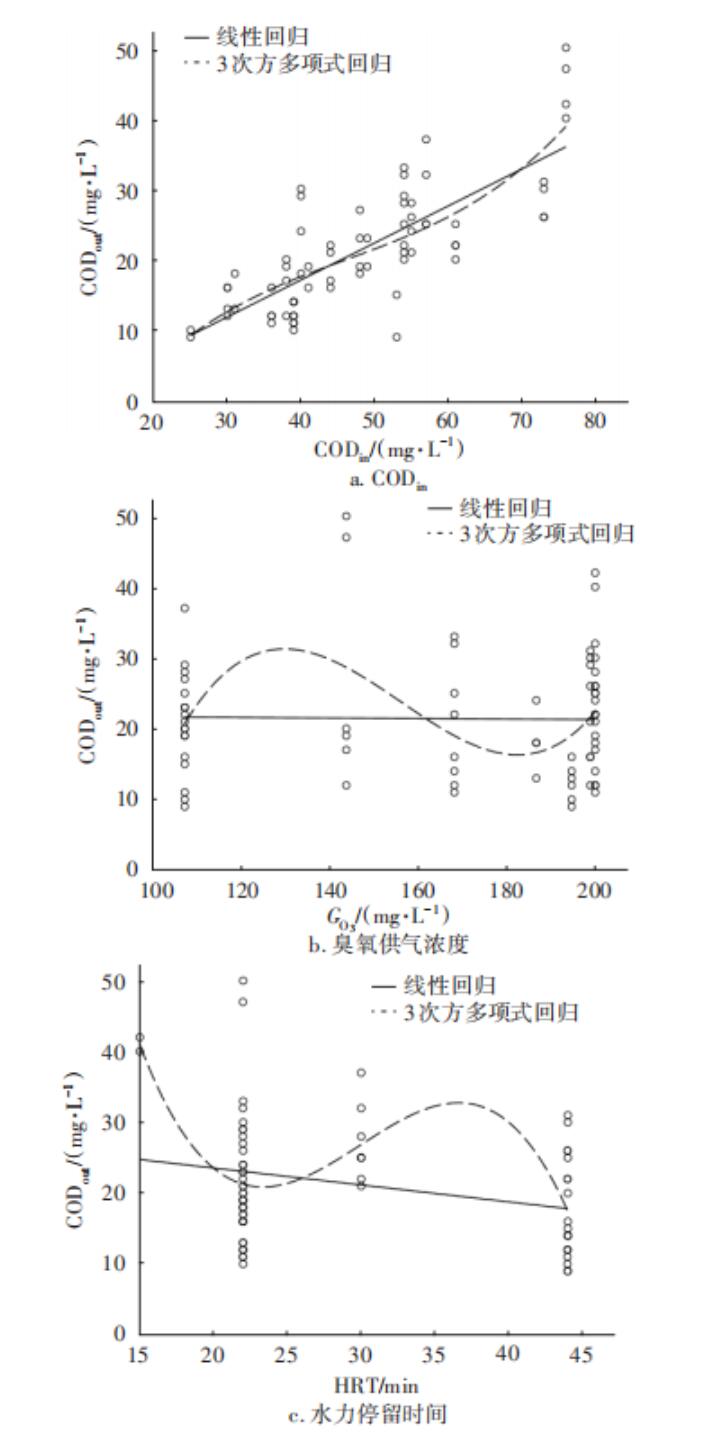 CODin:試驗點非常分散;不僅如此,線性回歸和3次方多項式回歸基本水平(略向下),由此可見進水CODin對處理效果影響的規(guī)律性不強。