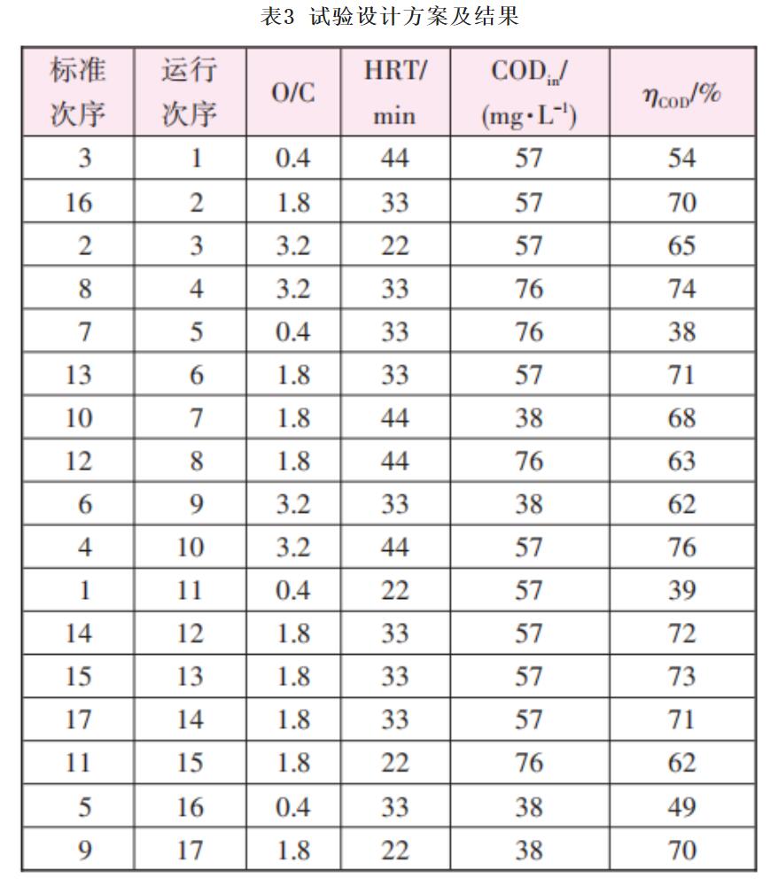 從圖4可以發(fā)現(xiàn),第12次“運行”為實際很優(yōu)值,當O/C值為1.8、HRT為33min、CODin為57mg/L時,ηCOD達到72% 。從圖4還可以發(fā)現(xiàn),當O/C值大于1.2時,可以保證ηCOD在60%以上;但要達到更高的去除率,O/C要增加很多,且逐漸趨于極限,因此工程上是不經濟的。