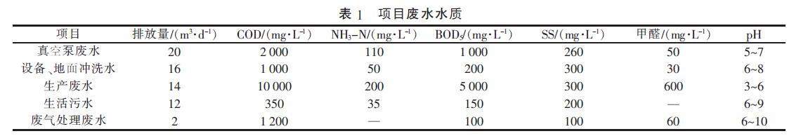 聚氨酯生產(chǎn)中原輔材料主要有聚醚多元醇、液體甲醛、三聚氰胺、尿素、雙氰胺、助劑。項(xiàng)目的產(chǎn)污節(jié)點(diǎn)主要是真空條件下進(jìn)行脫揮及短程分子蒸餾產(chǎn)生的生產(chǎn)廢水,設(shè)計(jì)水量為20 m3/d。該廢水中主要含有甲醛及含氮有機(jī)物,有腥臭味。廢水呈白色乳狀液,主要是水溶性物質(zhì)引起,無法通過自然沉降的方式達(dá)到分離。該廢水COD、甲醛類化合物含量較高,生物毒性較大,且可生化性較差,不能直接采用生化方法〔2〕進(jìn)行處理,需對(duì)其進(jìn)行分質(zhì)預(yù)處理。真空泵廢水、生活污水和沖洗廢水等其他廢水設(shè)計(jì)水量為80m3/d, 其與經(jīng)過預(yù)處理的生產(chǎn)廢水一起匯入調(diào)節(jié)池進(jìn)行后續(xù)處理。
