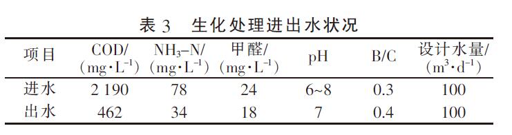 2019 年5 月新建廢水處理站完工并投入使用。該廢水處理工程年運(yùn)行費(fèi)用為18.6 萬元,其中,動(dòng)力費(fèi)8.7 萬元/a,藥劑費(fèi)7.4 萬元/a,人工費(fèi)1.4 萬元/a,固廢處置費(fèi)1.1 萬元/a。廢水處理系統(tǒng)運(yùn)行穩(wěn)定后,出水水質(zhì)范圍: 甲醛0.8~3 mg/L,COD 190~350 mg/L,氨氮20~35 mg/L,pH 7~8,達(dá)到接管標(biāo)準(zhǔn)。