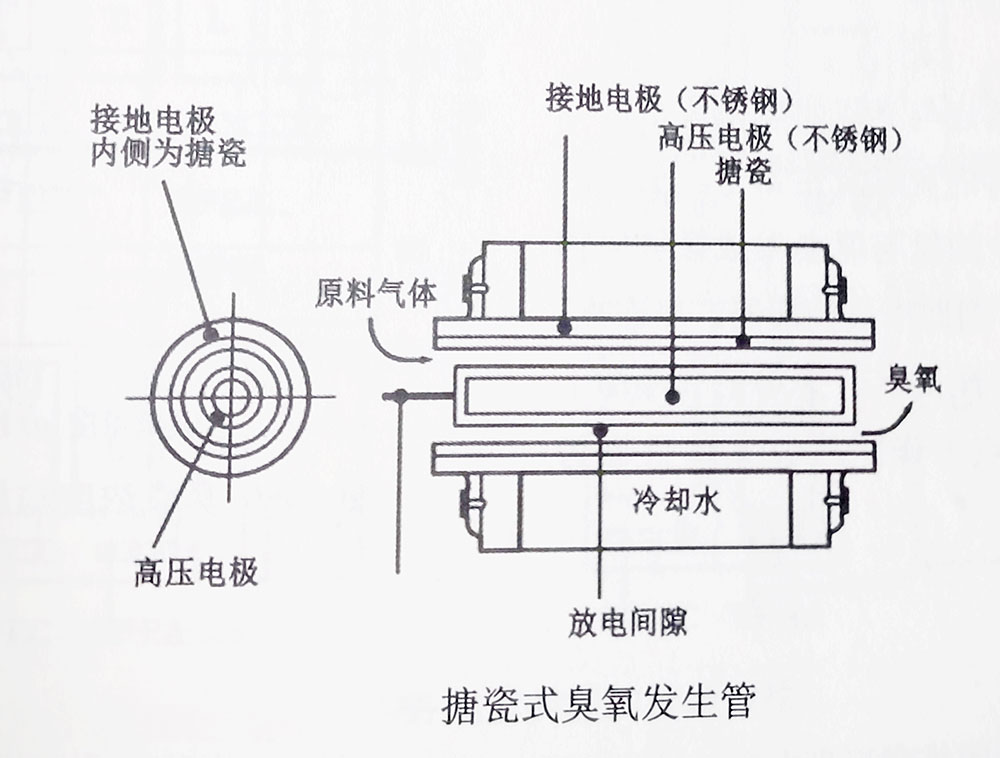 其長(zhǎng)度與直徑與玻璃管插入式臭氧發(fā)生管基本相同,其糖瓷融接在接地電極內(nèi)側(cè)。電極冷卻僅靠外側(cè)的接地電極單面冷卻。此糖瓷式臭氧發(fā)生管也有冷卻水在內(nèi)側(cè)電極循環(huán)的雙面冷卻形式。
