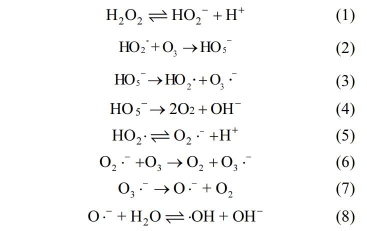水 本文研究了在恒定臭氧濃度(84mg/L)下,不同H2O2投加量(以 30%濃度的 H2O2溶液計(jì))對(duì)焦化廢水 COD 去除效果的影響.投加 H2O2 顯著地促進(jìn)了O3/TiO2-NF對(duì) COD 的去除(圖 2a),當(dāng) H2O2投加量為5g/L 時(shí),O3/TiO2-NF/H2O2 工藝(60min)的 COD 去除率 63.6%,是 O3/TiO2-NF 工藝(25.8%)的 2.5 倍.此外,圖 2b 還顯示 H2O2 投加量從 0.1g/L 增加到5g/L,COD 去除動(dòng)力學(xué)常數(shù)從 6.55×10-3min-1 增加到 2.21×10-2min-1,提高了約 3.4 倍.這是因?yàn)橥都親2O2 促進(jìn)了 O3 均相轉(zhuǎn)化為羥基自由基.由于 HO2-與 H2O2 解離平衡(式(1),pKa=11.8)[19], H2O2 通過(guò)解離產(chǎn)生 HO2-,其會(huì)與 O3 分子發(fā)生快速鏈?zhǔn)椒磻?yīng)(式(2),二級(jí)反應(yīng)動(dòng)力學(xué)常數(shù) - HO ,O2 3k = × 9.6 6 10 mol/(L s) ⋅ ,產(chǎn) 生 HO2•和 O3•,在進(jìn)一步生成強(qiáng)氧化劑·OH[20],如式(3~8)所示.
