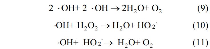 然而,過(guò)量地增加 H2O2 并不會(huì)進(jìn)一步提升COD 去除率,反而會(huì)抑制 COD 去除率和速率.如圖 3 所示,當(dāng) H2O2 投加量增加到 10g/L 時(shí),COD去除率和反應(yīng)動(dòng)力學(xué)常數(shù)分別降低到 56.2%和k10g/L =1.49×10-2min-1,相比 5g H2O2/L,降幅分別為 11.6%和 32.4%.這主要原因是溶液中存在大量 H2O2 時(shí)會(huì)與·OH 發(fā)生淬滅反應(yīng)[21],如式(9~11)所示.