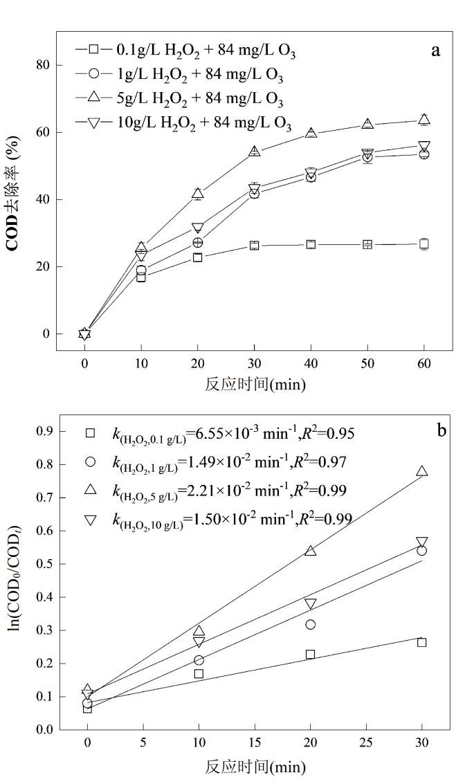 圖 2 不同 H2O2投加量下,O3/TiO2-NF/H2O2工藝對(duì)焦化廢水COD的去除率(a)和COD去除動(dòng)力學(xué)(b)