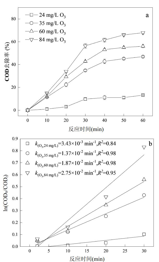 圖 1不同臭氧濃度下,O3/TiO2-NF 工藝對(duì)焦化廢水 COD 的去除率(a)和 COD 去除動(dòng)力學(xué)(b)