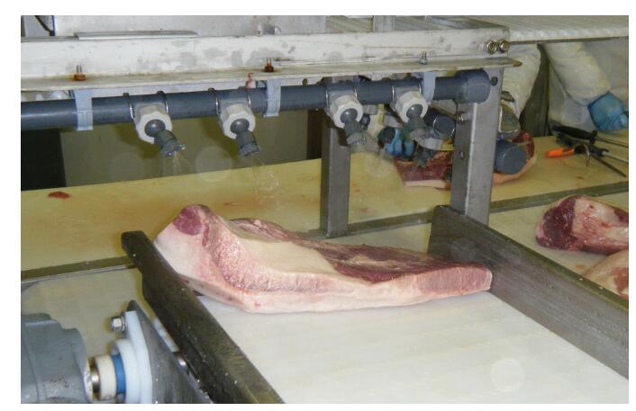 在這些應用中,水被用作臭氧的載體。這些水必須與任何需要消毒的表面直接充分接觸。這可能是肉本身、加工表面、機器、刀具和其他設備。噴嘴應在 10-30 PS 的水壓下輕柔地噴水,無需刺鼻或霧化噴霧,以確保水中臭氧的排氣量更小。表面與水的接觸時間應大于1秒。在輸送機系統(tǒng)上,使用圓形或方形圖案的噴嘴,以便在肉表面上噴灑 3 秒鐘,或使用多個噴嘴。有關詳細信息,請參閱下面的一些圖像。