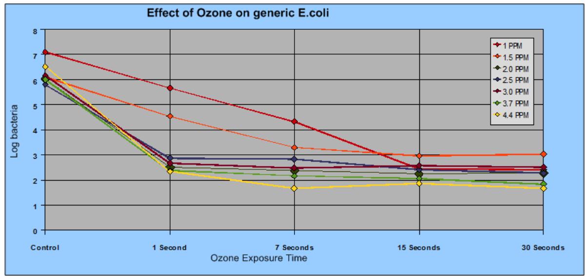 我們所做的工作表明,低于2.0 ppm的臭氧水平可以有效地消除細菌,但需要更長的接觸時間。而臭氧濃度高于2ppm對效果微乎其微。有關這項工作的更多細節(jié),請參閱下面的圖表和此處的論文參考。