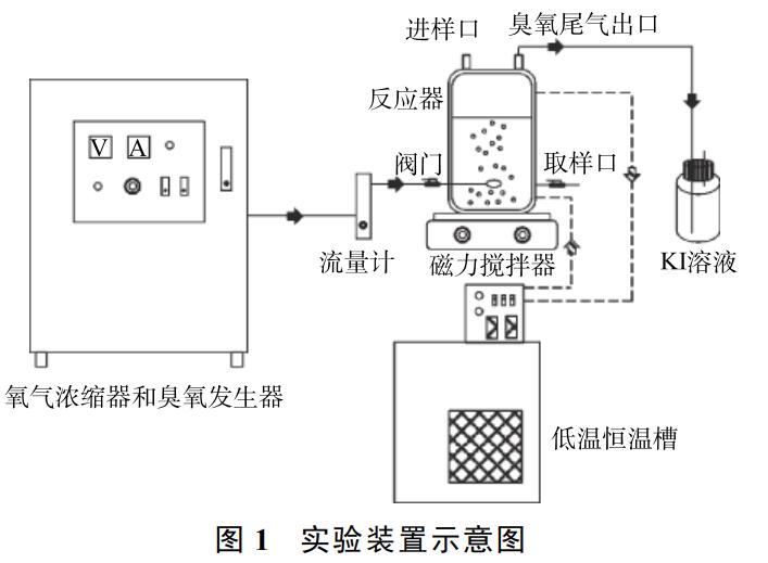 實驗裝置如圖 1 所示。將 1.5 L 垃圾滲濾液注入圓柱形夾套式高硼硅玻璃反應器,反應器內(nèi)徑為 150 mm、高為 200 mm。臭氧由以氧氣為氣源臭氧發(fā)生器產(chǎn)生,其更大臭氧產(chǎn)量為 10 g·h−1,由耐腐蝕轉(zhuǎn)子流量計調(diào)節(jié)進入反應器的臭氧量,經(jīng)微孔擴散器進入反應器內(nèi)。開始反應時,加入藥劑 (H2O2/Na2S2O8/KHSO5),并開啟磁力攪拌器。反應過程中溫度由低溫恒溫槽 調(diào)控。