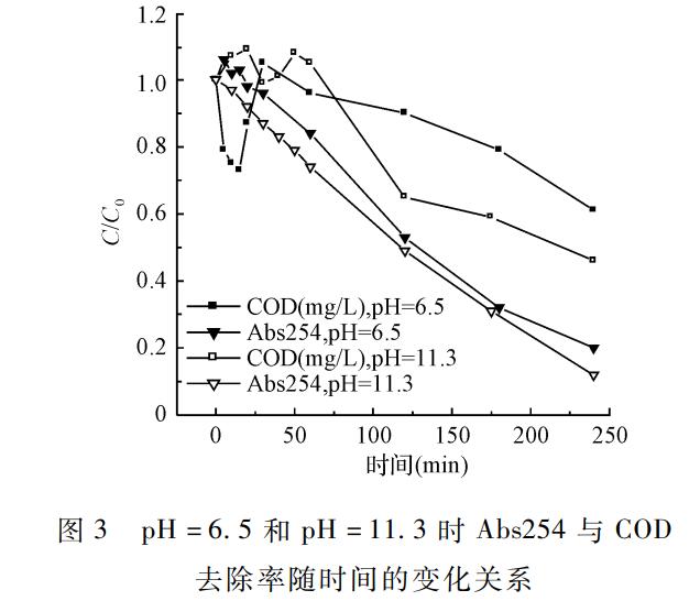 當(dāng)pH=6.5時,反應(yīng)自始至終都存在臭氧的氣味,可以判定反應(yīng)過程中有臭氧分子參與反應(yīng)。從圖3可以看到,預(yù)處理出水COD及Abs254整體趨勢是下降的,但在COD變化曲線中出現(xiàn)了2個拐點(diǎn):15min和60min。15min前,COD下降幅度較大;這是因?yàn)閺U水中含有較多的苯系污染物質(zhì),臭氧與帶有供電子取代基的芳香化合物反應(yīng)速度很快[7] ,導(dǎo)致COD迅速下降;15 ~60 min,COD急速上升;同時300 nm左右產(chǎn)生吸收峰,并有上升的趨勢,而254nm處吸收峰在不斷下降,說明反應(yīng)過程中可能生成了某種中間體。